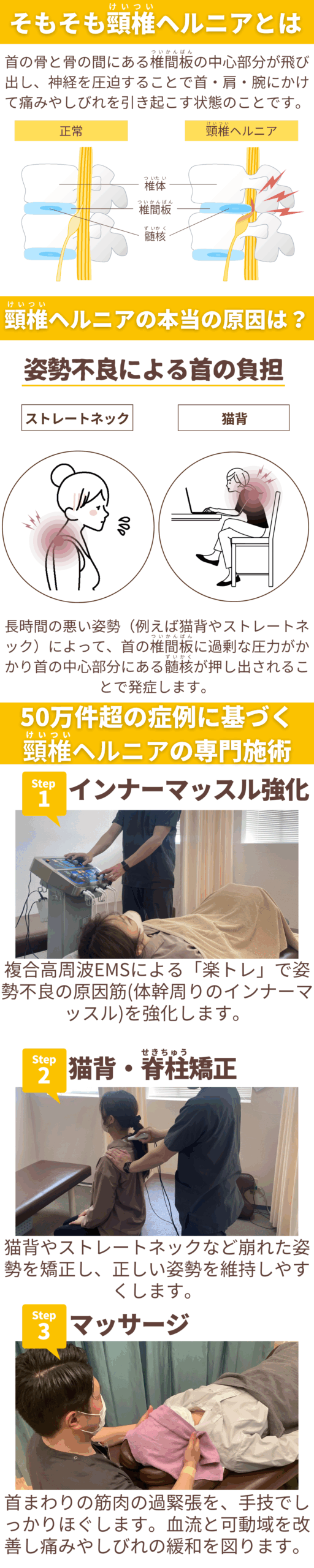メニュー メニュー トップページ 症状別メニュー メニュー 頸椎ヘルニア 肩こり 腰痛 脊柱管狭窄症 猫背・姿勢矯正 こんなお悩みでお困りではありませんか? こんなお悩みでお困りではありませんか? 首から腕、指先にかけて痺れがある 痺れで指に力が入らない 首の痛みが激しくて寝れない 病院で処置を受けているがなかなか改善しない どれか1つでもあてはまる方は… 今すぐ当院に ご相談ください 今その悩みを放っておくと、症状のさらなる重症化・長期化につながります。ですが安心してください。当院の頸椎ヘルニア改善の専門技術や最新設備、負担が少なく継続しやすい施術と料金設定で、お客様のお悩みを解消します!! クオルドの強み 専門的なスキルと知識 01 全スタッフが国家資格を保有し、初回研修や月ごとの技術研修、専門家からの指導を通じてスキルと知識を継続的に強化しています。50万件超の豊富な症例をもとに、他院では改善しなかった症状にも根本から改善へ導きます。 最新機器による効果的で 身体にやさしい施術 02 医学的に効果が認められた最新機器を使用した施術により、通常のトレーニングでは鍛えにくいインナーマッスルや、手技では届きにくい神経にも直接アプローチが可能です。身体への負担を抑えながら、より効果的に症状の根本改善を目指せます。 保険診療のため 継続しやすい 03 中長期的な施術が必要な患者様でも安心。金銭的な負担が少なく改善するまで安心して通えます。 クオルドと他院はココが違う! クオルドと他院はココが違う! \お客さまの声/ つらい首の症状を抱えていたお客様の声 「毎度状態を確認して下さり、帰る時には確実に良い状態になっています。首のヘルニアは非常に辛いですが、先生のお陰で助かっております。ありがとうございます。」 ※お客様の感想であり効果を保障するものではありません 来院から施術までの4つの流れ 来院から施術までの4つの流れ STEP1 症状の問診 来院後、受付にてカウンセリングシートを記入いただき、50万件超の豊富な症例対応実績を元に丁寧にヒアリングいたします。 STEP2 検査・状態の説明 ヒアリングをもとに、姿勢分析アプリやハイボルト機器を使用し、筋肉や関節の状態を丁寧に検査します。痛みの変化は毎回10段階で確認し、専門用語を使わずわかりやすくご説明。あわせて、治療の頻度や期間も明確にご案内いたします。 STEP3 施術 国家資格を持つスタッフが、50万件超の症例実績と最新機器を活かして、通常の手技では届きにくい筋肉や神経にもアプローチ。医学的に効果が認められた機器を用いることで、身体への負担を抑えつつ、根本改善を目指します。 STEP4 セルフケア指導・施術計画 早期改善・再発防止に向けて自宅でできるセルフケアや生活指導を行うとともに、今後の効果的な施術計画をご提案します。 よくあるご質問 Q. 決済方法を教えてください。 A. 現金・クレジットが使用可能です。 Q. 健康保険は使えますか? A. 健康保険はもちろんのこと、母子家庭・乳幼児・子ども・障害・原爆医療助成制度なども適応されますのでご安心してご来院ください。 その他、労災や交通事故の自賠責保険による施術も行っております。 Q. 施術の流れと時間を教えてください。 A. 施術を行う前に、症状や、お身体の状態を確認させて頂きたいため、30分程度カウンセリングをさせていただきます。その際に、適切な施術内容をご提案させていただき、ご納得頂いた上で施術を始めていきますのでご安心ください。 Q. 初めて行くとき、何か持ち物はありますか? A. 施術代金と、保険施術であれば保険証が必要になります。 Q. ちょっとした痛み、からだの違和感でも通院して良いですか? A. からだの不調は、ちょっとした痛みや、からだの違和感からはじまります。ちょっと肩が上がりにくい、腰のあたりがいつもと違う感じがする、体が重い、などは、不調のサインです。ひどくなってからや、間違った判断では、治療にも時間がかかってしまいます。からだの不調はプロの治療家にまずご相談ください。 Q. 事故後、数日経過してしまいましたが、施術を受けられますか? A. はい、もちろん可能です。基本的には受けられますが、事故後あまり時間が経過していると、事故との因果関係がはっきりしないと判断され施術が受けられない可能性があります。(一般的には2週間以内が望ましいです)少しおかしいなと感じたら、早めに受診しましょう。 院長からのメッセージ 初めまして。院長の嶋崎雄大です。柔道整復師の資格を取得して15年、患者様のお悩みに最大限お応えできるように日々お身体に関する知識や施術技術の研鑽に努めてきました。当院はお怪我はもちろんの事、長年症状が改善せず悩んでいた方のお力になる事を使命として考えて院運営を行っております。お悩みの方はあきらめてしまう前に一度、当院へご相談ください。 Back to Top 店舗一覧 かぎとり接骨院 住所 宮城県仙台市太白区鈎取本町1-21-1 イオンス