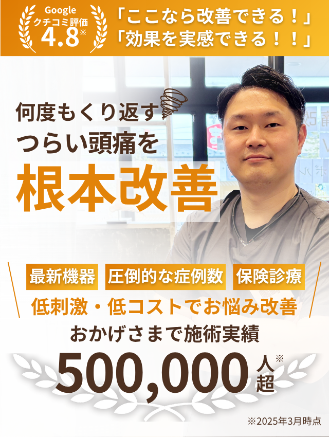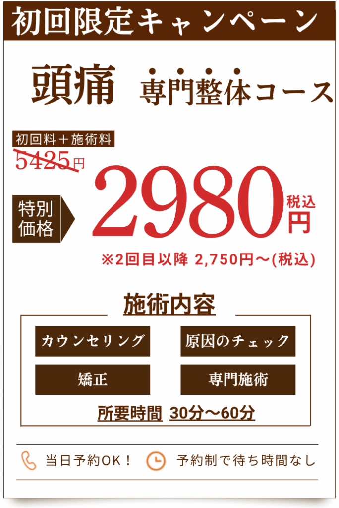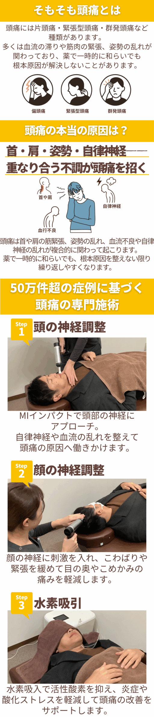 当院の頭痛に​特化した​専門技術最新設備を導入し、負担が少なく継続しやすい施術と料金設定で、お客様の​お悩みの​根本改善を​サポートいたします!!​